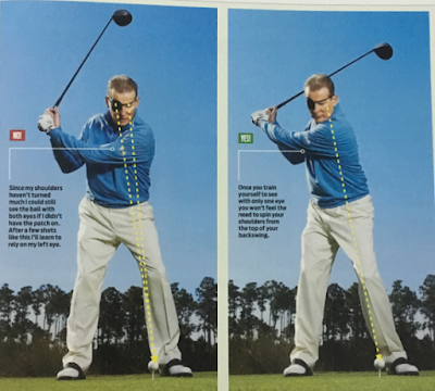 *** หัวใจของ Drill นี้คือ ต้องการให้เราคุ้นเคยกับการใช้ตาซ้ายในการ Focus ลูกกอล์ฟให้มากขึ้น Drill จากที่พวกเราลองกันคิดว่าน่าจะเหมาะมากกับคนที่มี Right eye dominant เพราะคนที่มี Right eye dominant นั้นจะพยายามที่จะมองลูกกอล์ฟด้วยตาขวาแต่ตาขวานั้นจะมองไม่เห็นลูกตามที่ได้อธิบายไว้ ซึ่งเป็นเหตุให้นักกอล์ฟพยายามหมุนหัวกลับเพื่อดูลูกด้วยตาขวาซึ่งจะ lead ไปเป็นอาการ Over the top นั้นเอง